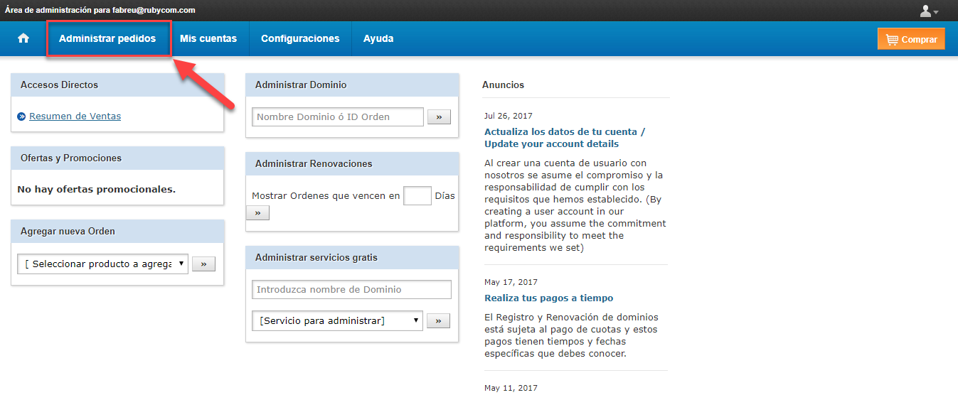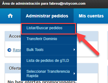 Ir a lista/buscar pedido ahí podremos ver el listado de dominio alojado en la cuenta.