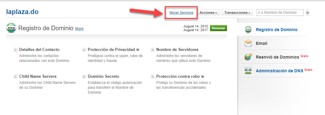 Seleccionamos un dominio cualquier para ejemplo y luego de dar clic en el dominio vamos a la selección marcada llamada MOVER SERVICIOS